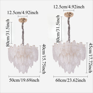 This chandelier transforms lighting into an art form with its cascading oval glass pieces that overlap like delicate crystal leaves. When illuminated, it creates a mesmerizing interplay of light and shadow, filling the room with a warm, enchanting glow.